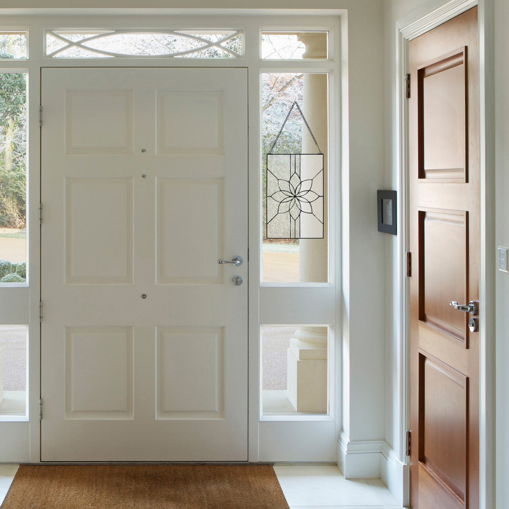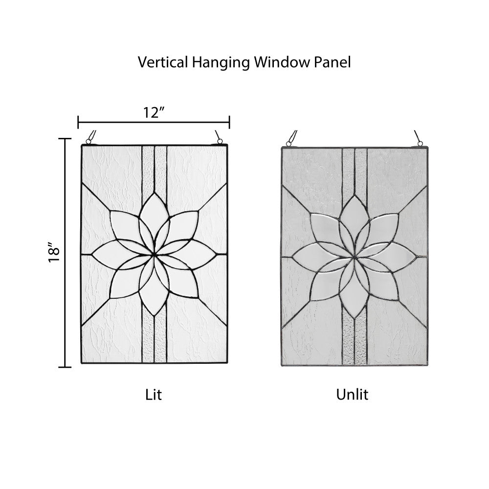 Add an elegant touch to your home décor with this 18-inch Floral Clear Glass Window Panel. This modern window panel features a mix of clear glass that is textured, etched and beveled to create an elegant floral design. The beautiful flower shape formed by beveled glass at the center adds a captivating element to the piece. A perfect addition to a sunny window, this panel comes to life when kissed by sunlight. Made with glass and metal, this piece is as stylish as it is functional.
