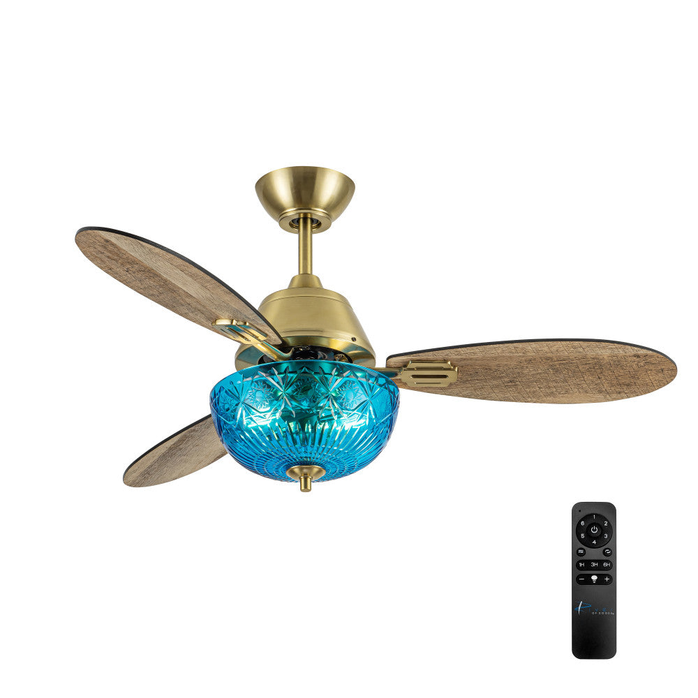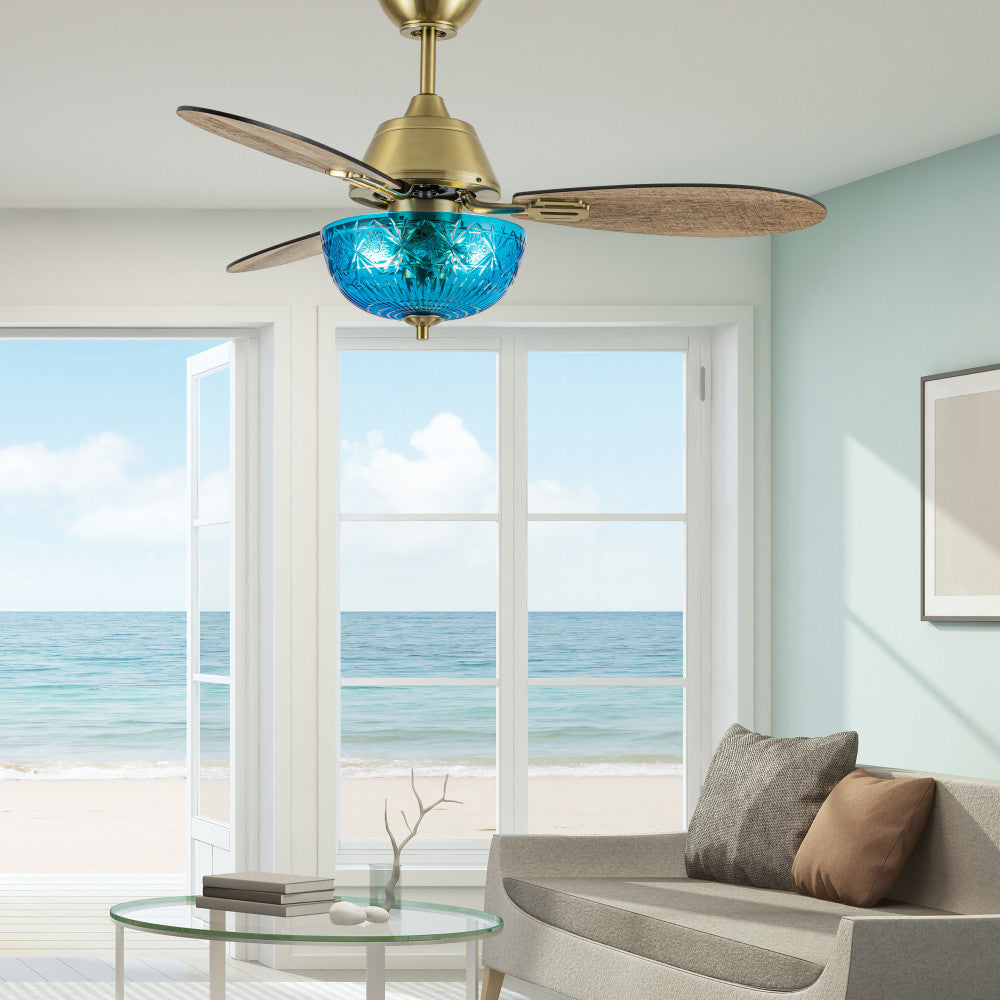 42" W Valencia LED Indoor Blue Hand-Cut Glass and Gold Finish Ceiling Fan with Remote Control