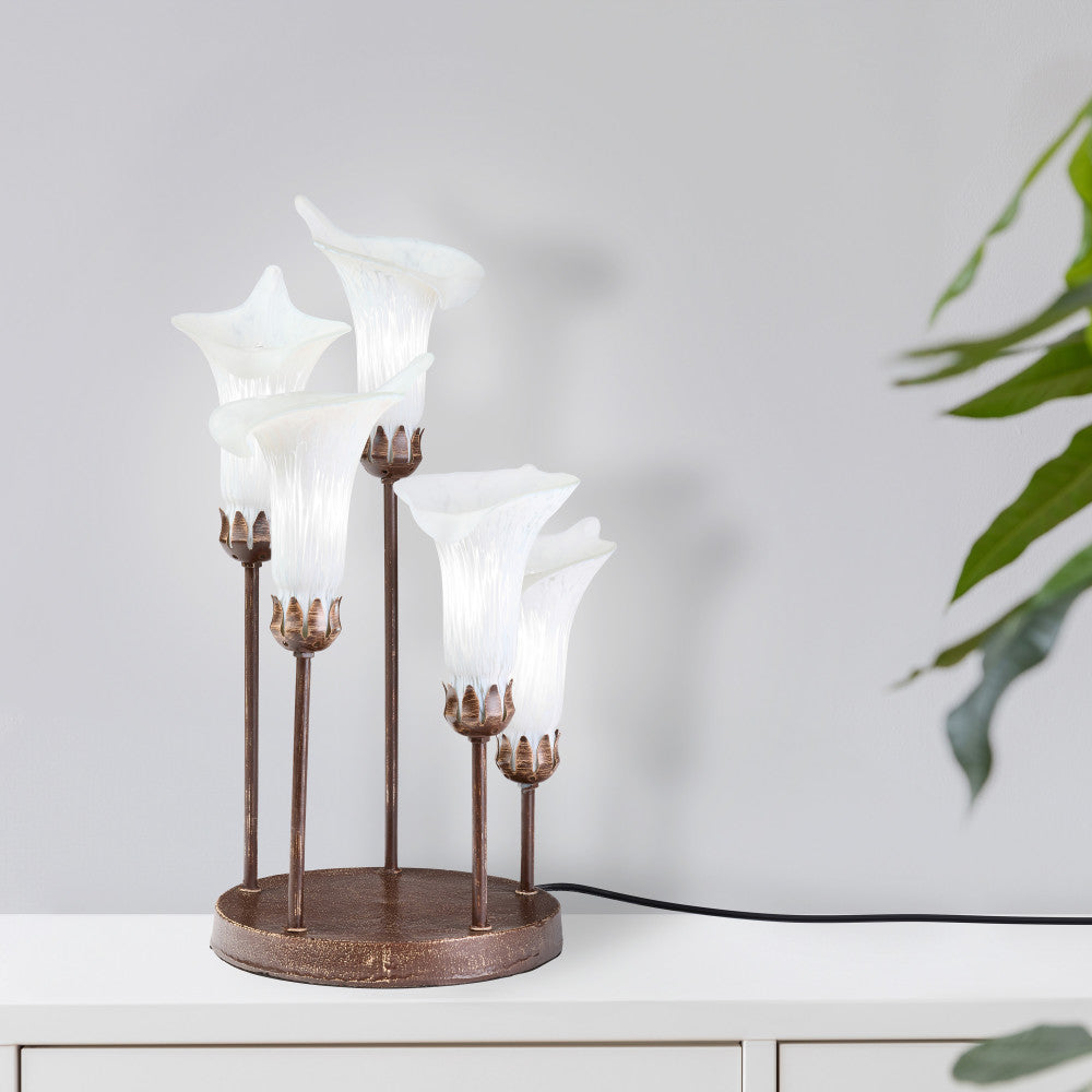 A stunning addition to any bohemian-inspired space, this table lamp features a unique blend of metal and glass materials that create a harmonious look. The hand-blown, white glass bell shades offer an elegant flower design, casting a warm and inviting glow. The intricate candlestick-shaped bronze base with a hand painted antiqued finish adds a touch of vintage charm. Perfect for a desk or side table, this lamp requires five 15-watt type C bulbs, ideal for creating a cozy, illuminated environment.