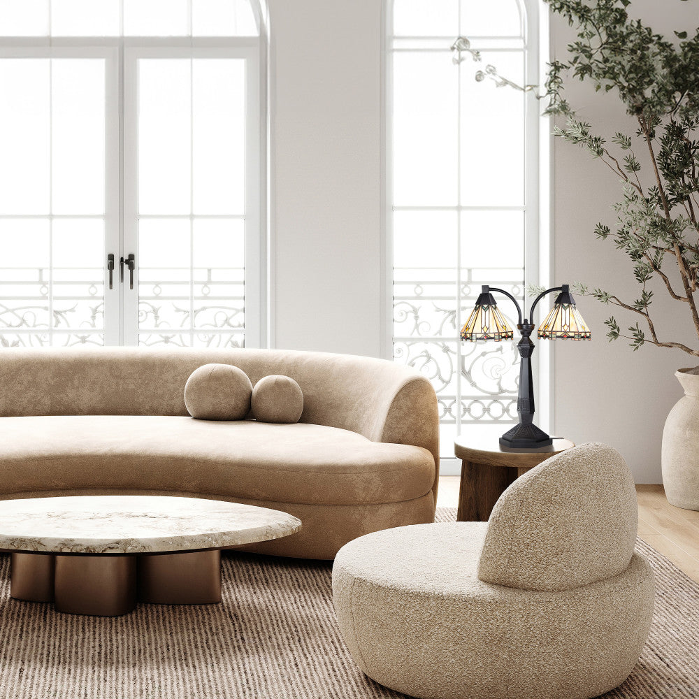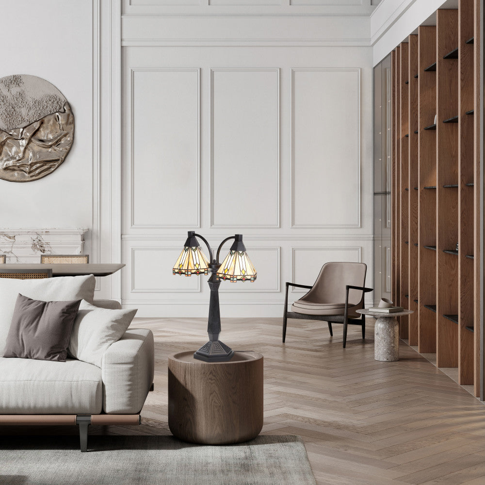 This traditional table lamp features an exquisite base fashioned from metal and polyresin in a rich black color, topped with two cone-shaped glass shades in multicolor hues of amber, ivory, orange, and green. It's style is sure to add a touch of elegance to any desk or side table. The lamp features two light bulbs, casting a gentle downlight to enhance the atmosphere in your space. With the in-line switch, turning the light on and off is a breeze. The lamp requires assembly upon arrival and comes with detailed instructions (bulbs not included).