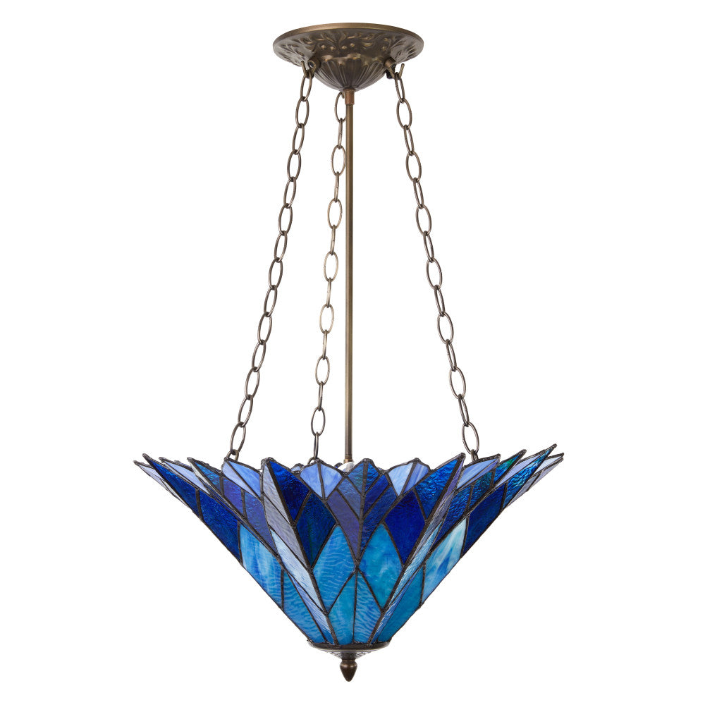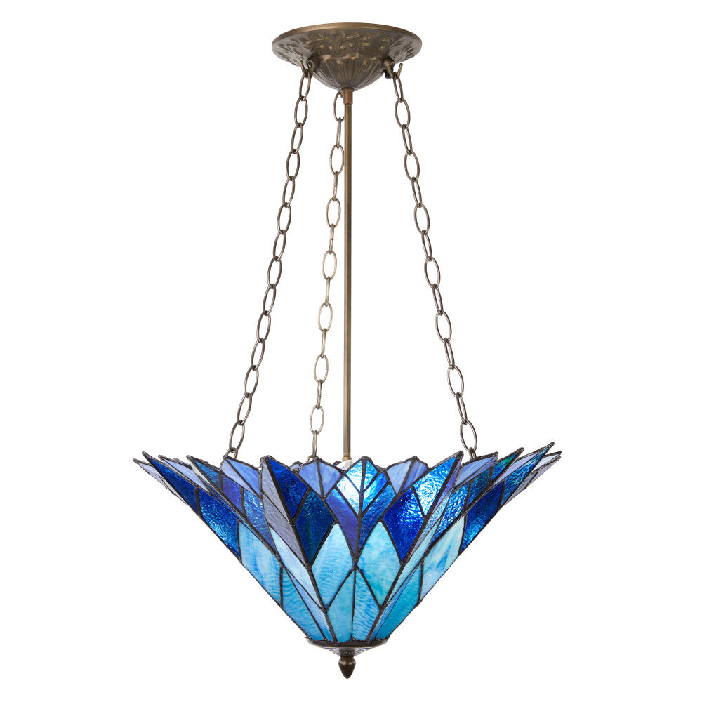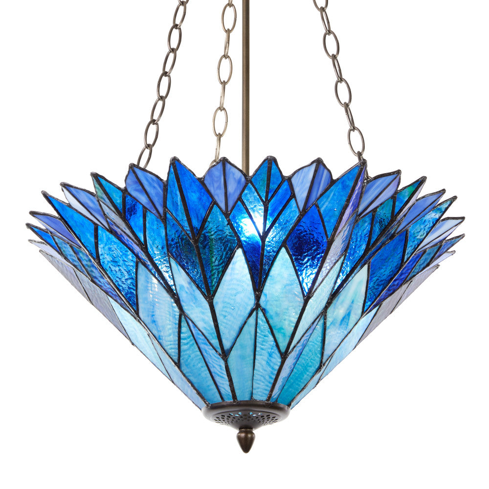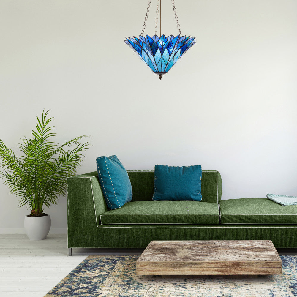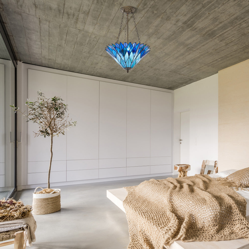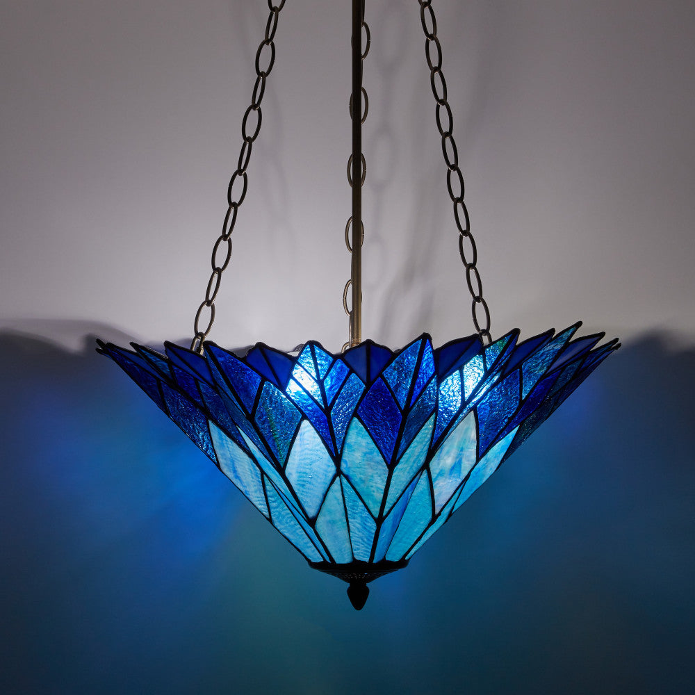 This Tiffany-style pendant light is meticulously crafted from shades of blue stained glass pieces, creating an elegant feather-like design that adds a touch of bohemian flair to any space. The aqua, blue, and purple hues of the shade are artistically arranged in a mesmerizing pattern, casting an inviting uplight glow. The shade's 144 rippled and striated stained glass pieces, in combination with the metal fixture, establish a balance between traditional craftsmanship and modern aesthetics. It's a significant addition to your home décor for those who appreciate handcrafted beauty.