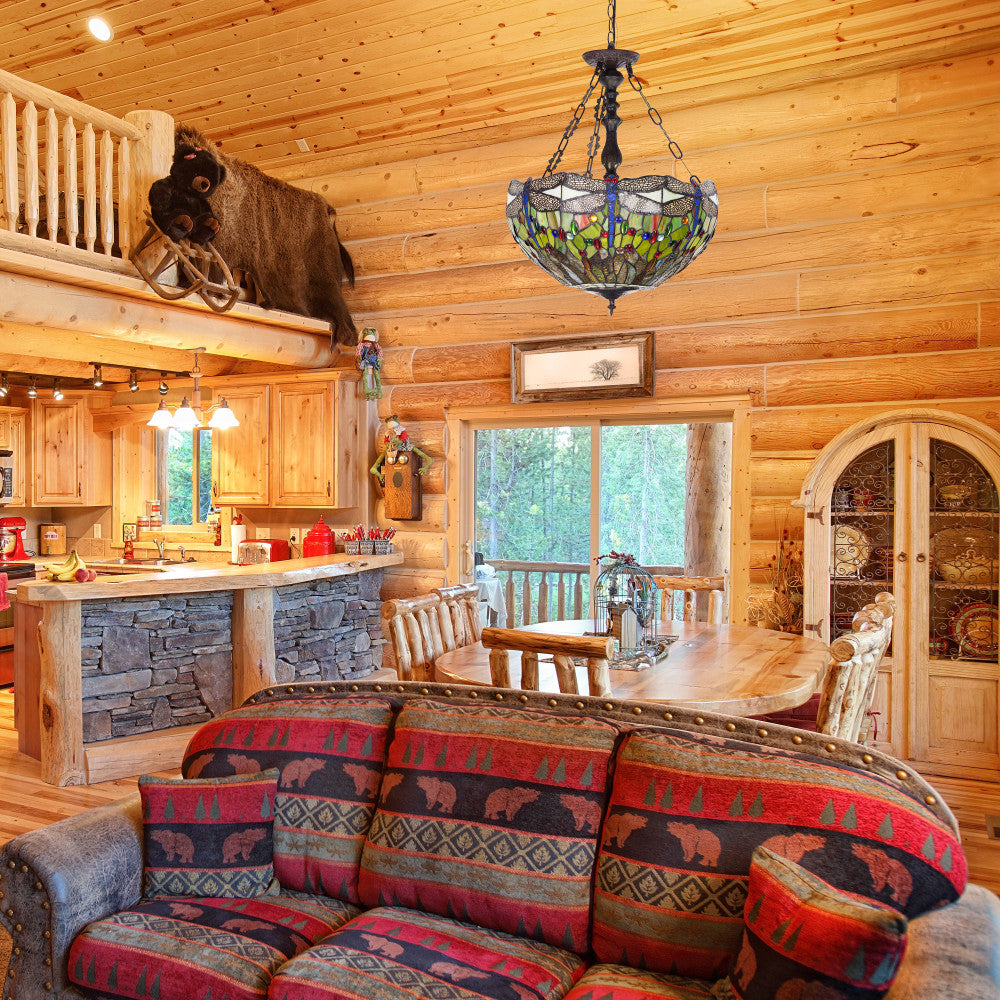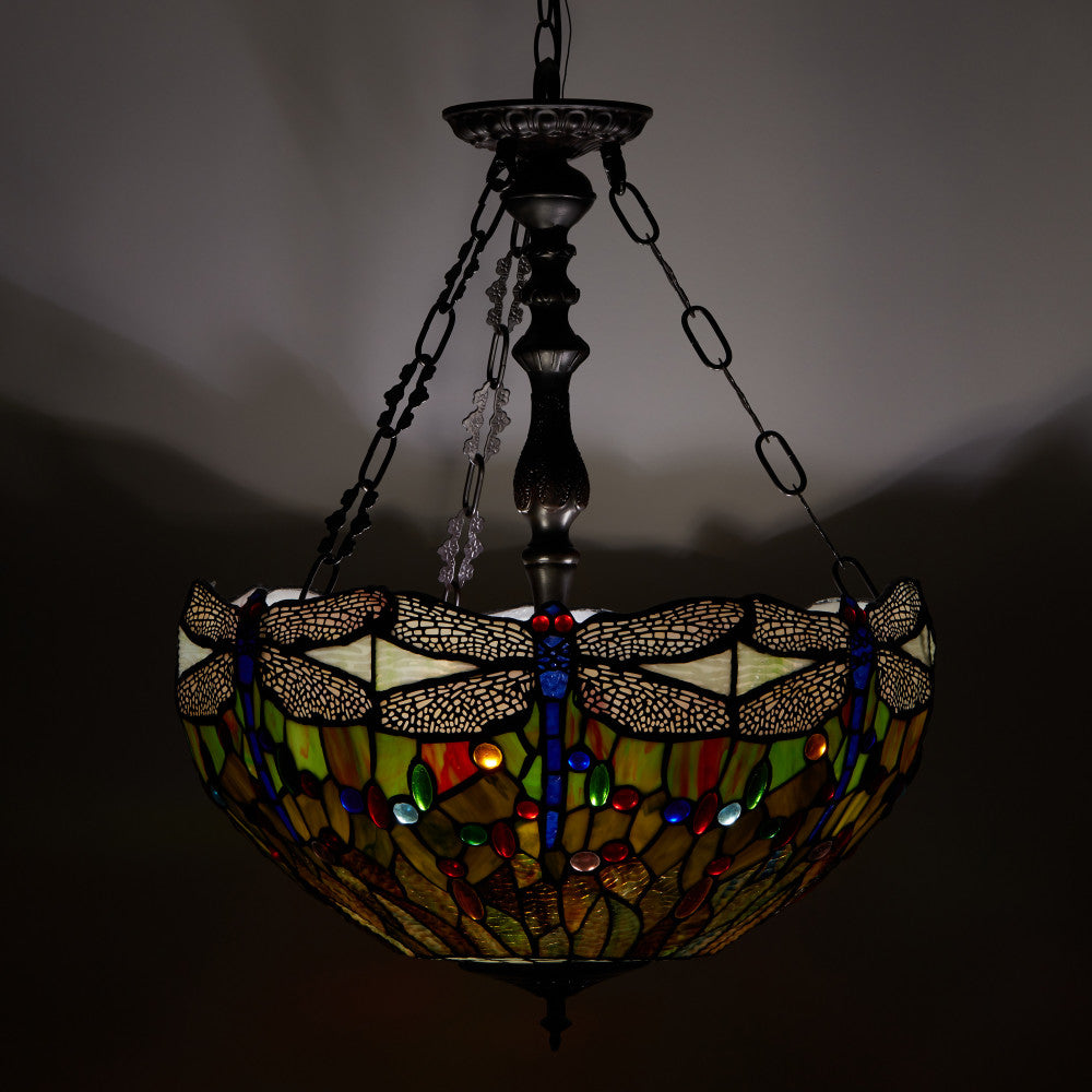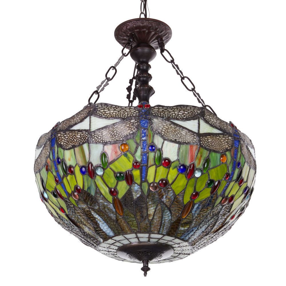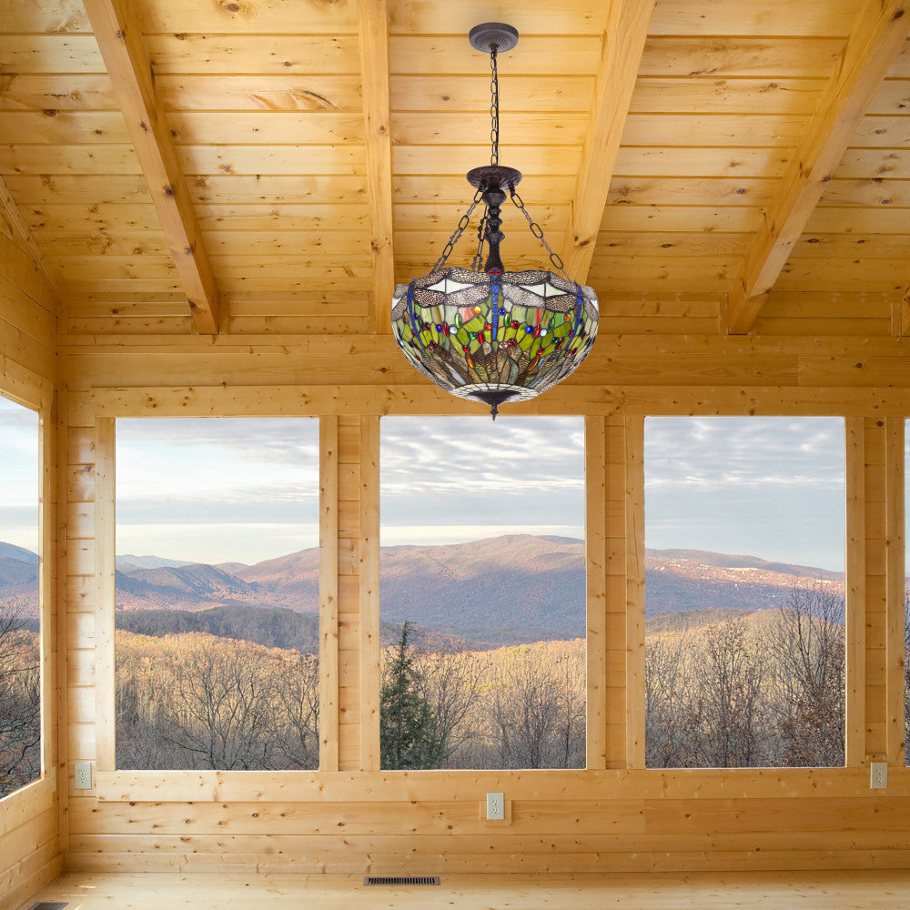 Embrace the art of illumination with this exquisite pendant light, meticulously crafted from 476 multi-color stained glass pieces and adorned with 119 cabochons. The cabin & lodge-style design offers an uplight direction, casting a soft, ambient glow that's perfect for setting a relaxing mood in any room. The shade features an intricate array of dragonflies, their heads and wings forming the rim, creating a striking visual display. The green, blue, and orange colors of the stained glass contribute to a unique and captivating aesthetic. With an adjustable hanging cord, it is easy to adjust the height according to your preference.