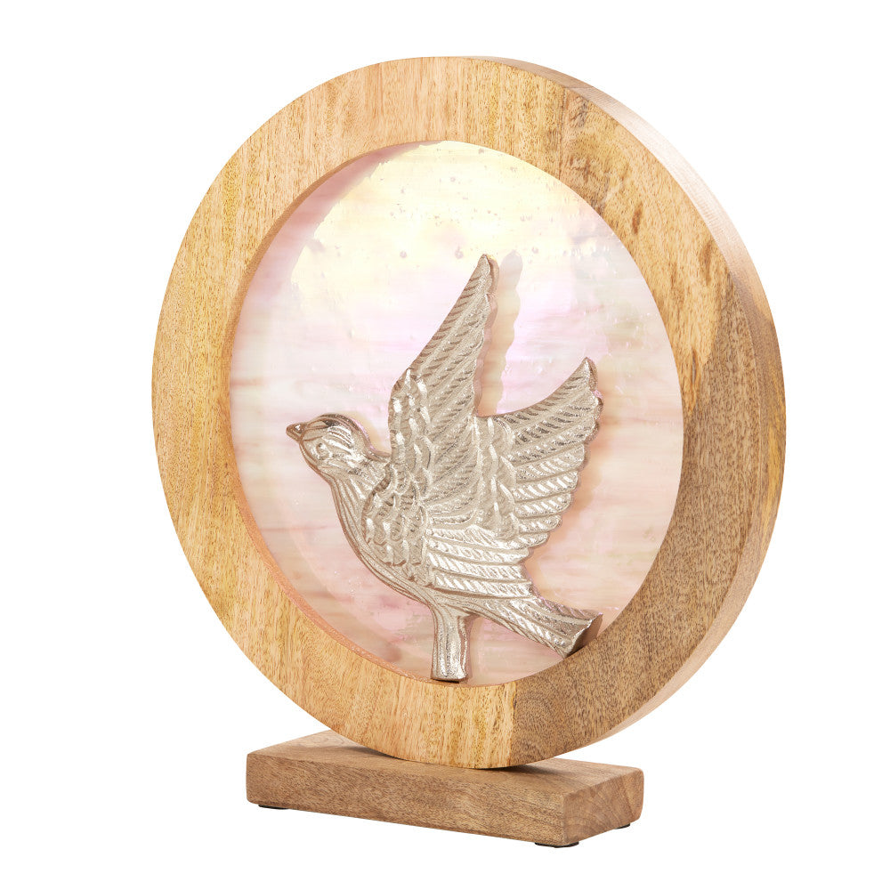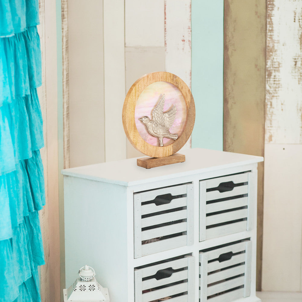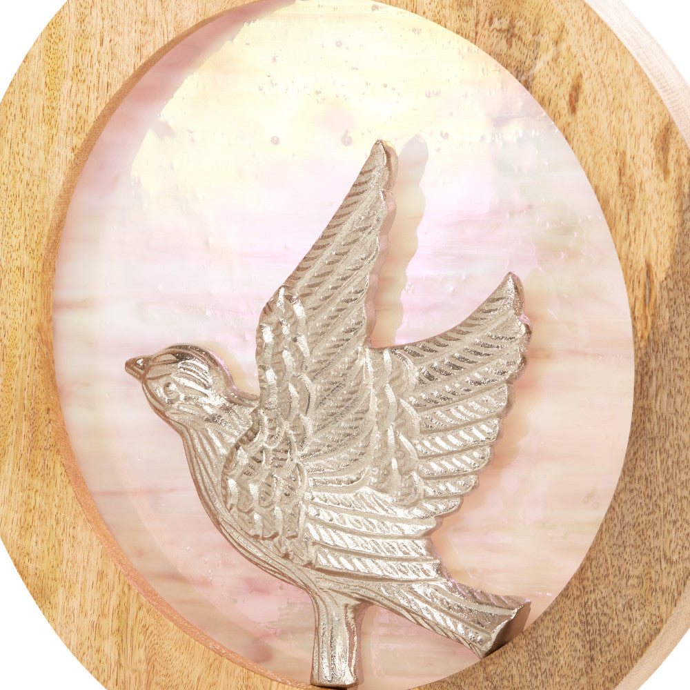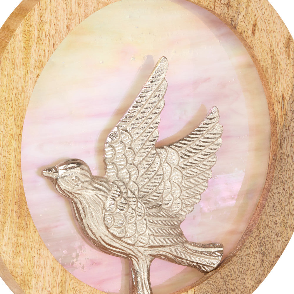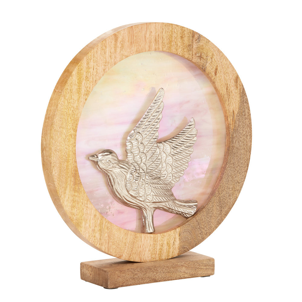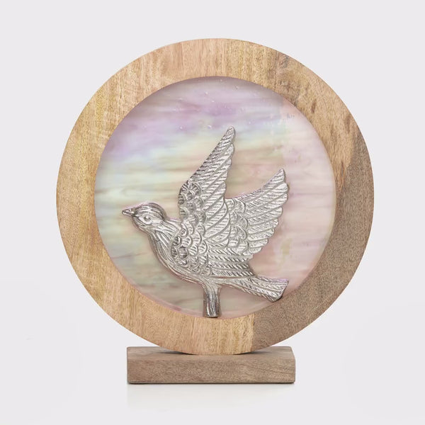 14" W Bird Theme Round Decorative Stained Glass & Metal Stand with Wood Frame