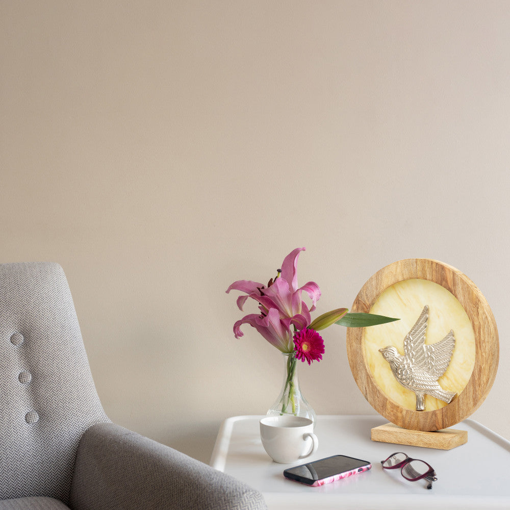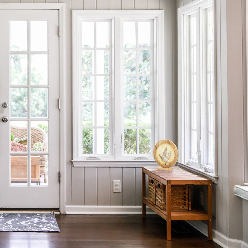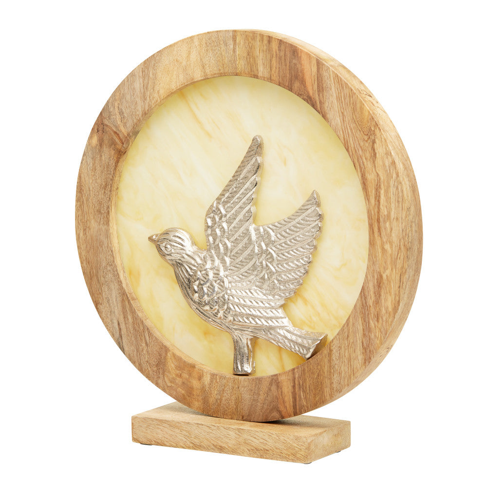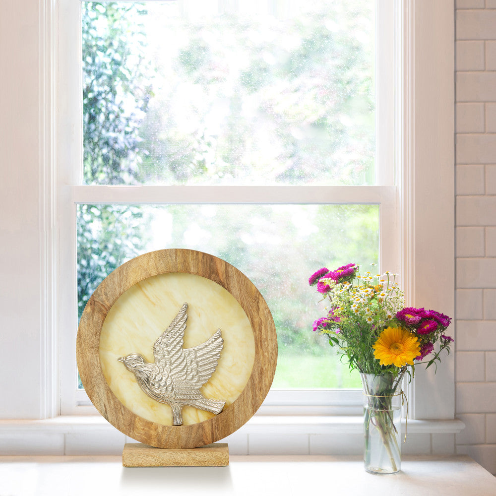 14" W Bird Theme Round Decorative Stained Glass & Metal Stand with Wood Frame