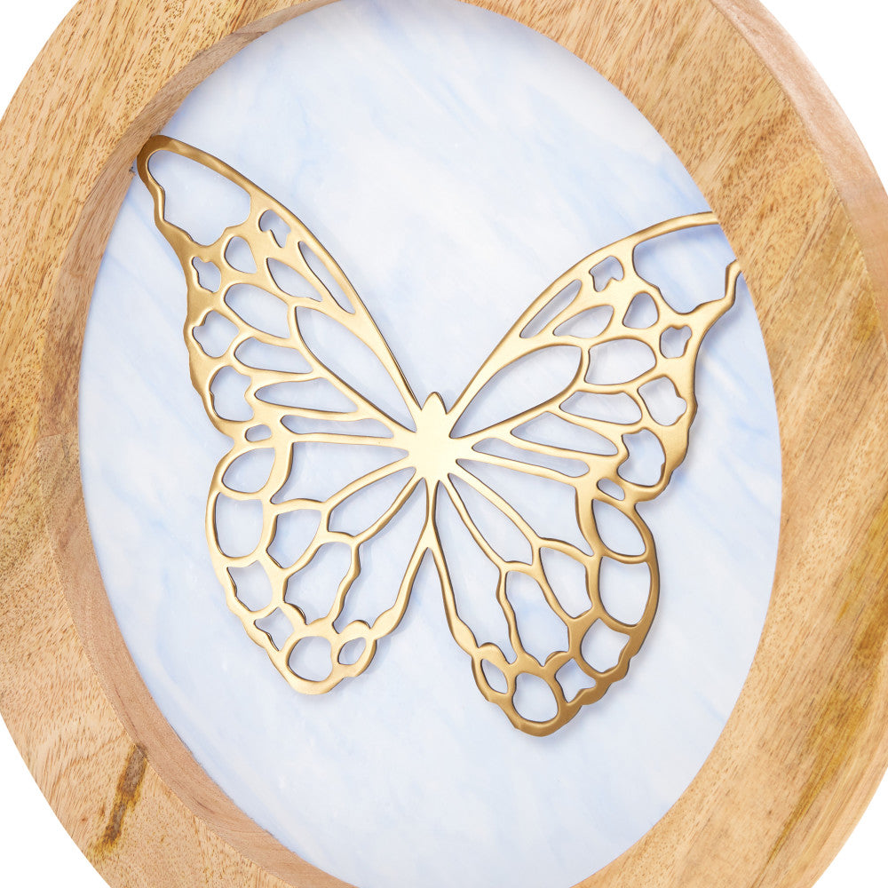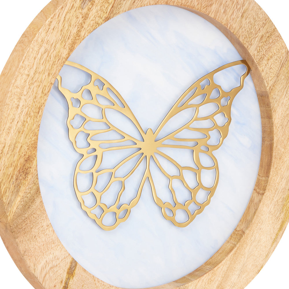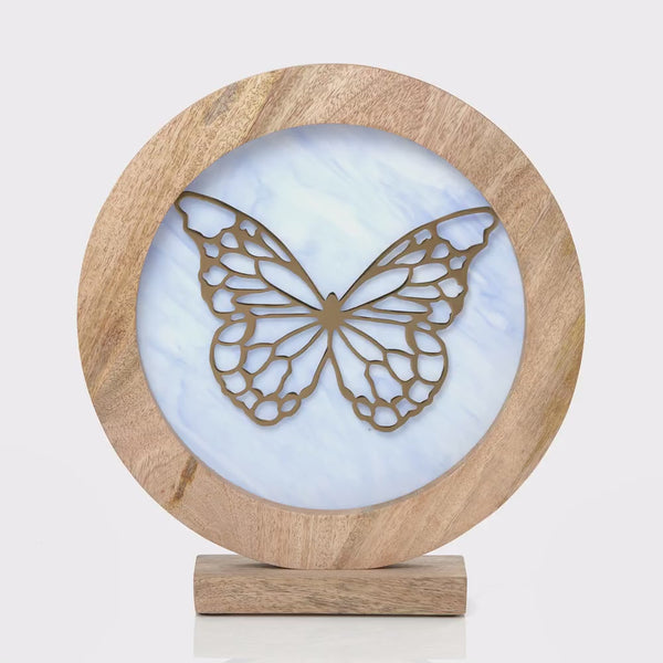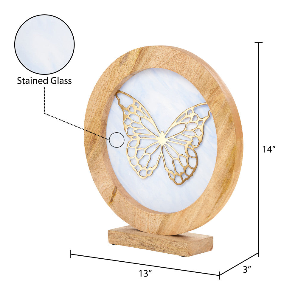 14" W Butterfly Theme Round Decorative Stained Glass & Metal Stand with Wood Frame