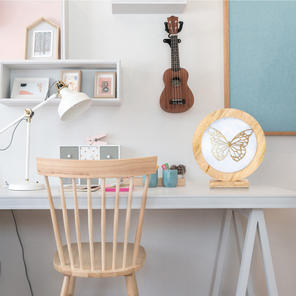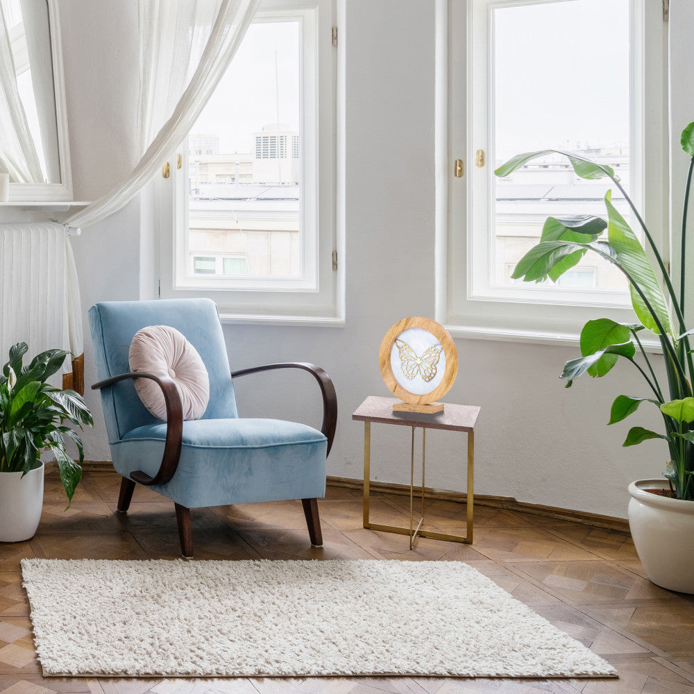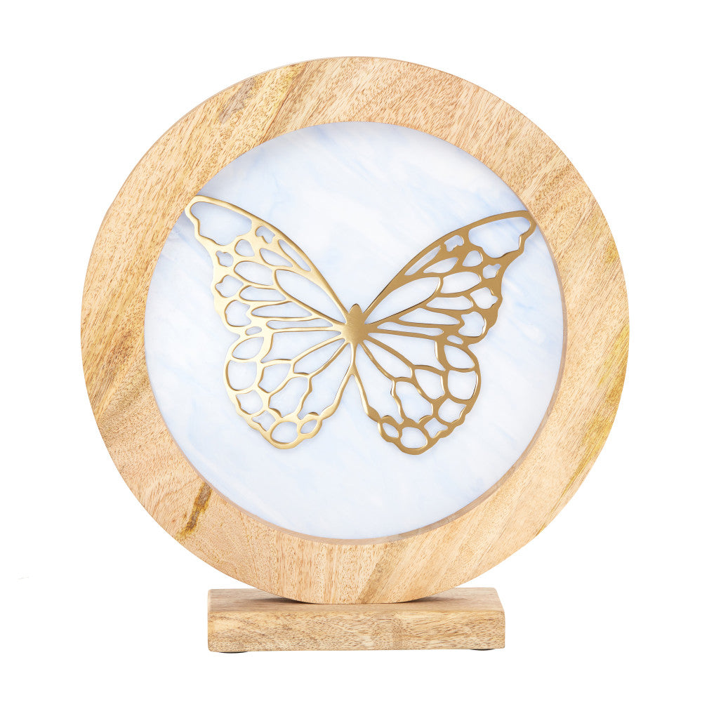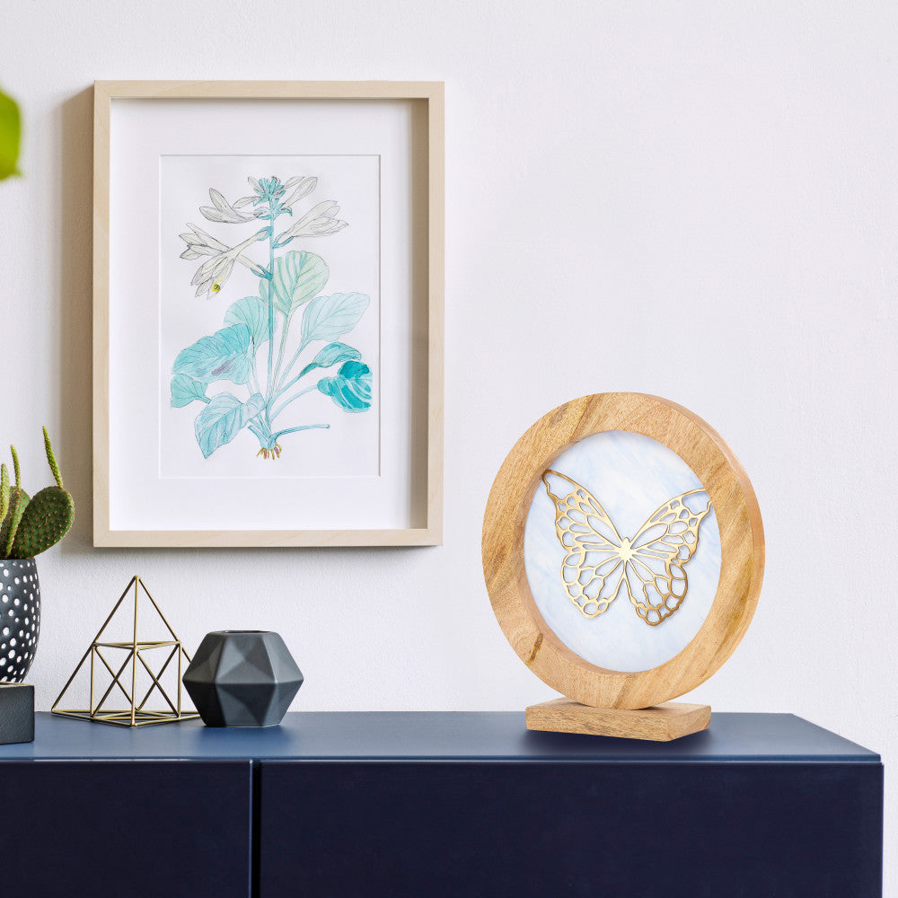 14" W Butterfly Theme Round Decorative Stained Glass & Metal Stand with Wood Frame
