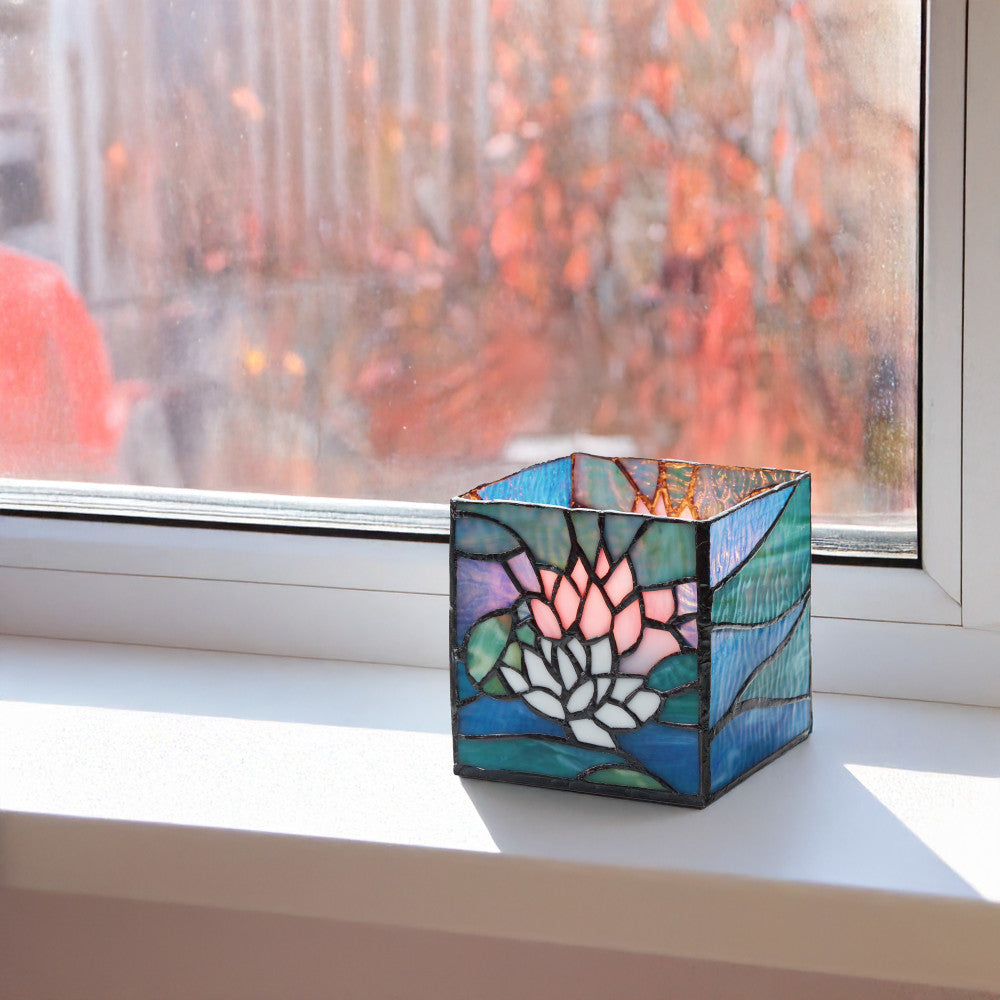 Bring a touch of nature indoors with this stunning stained glass candle holder featuring delicate Blue Pond Lillies. Crafted with care, this piece of art showcases a beautiful array of colors that will add elegance to any room. When candlelight passes through, it illuminates the intricate design, creating a mesmerizing display of colors. This candle holder is easy to maintain with simple cleaning instructions, ensuring it remains a vibrant focal point. Perfect for adding a touch of artistry to your home decor.