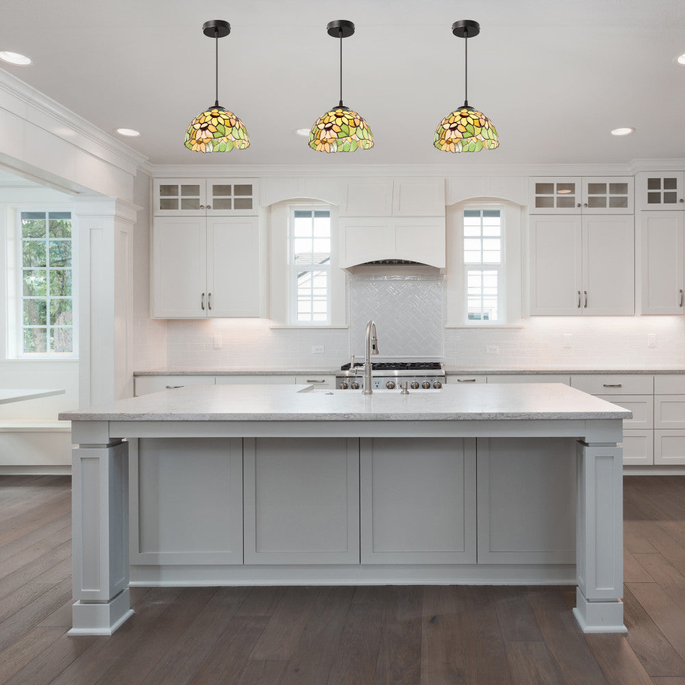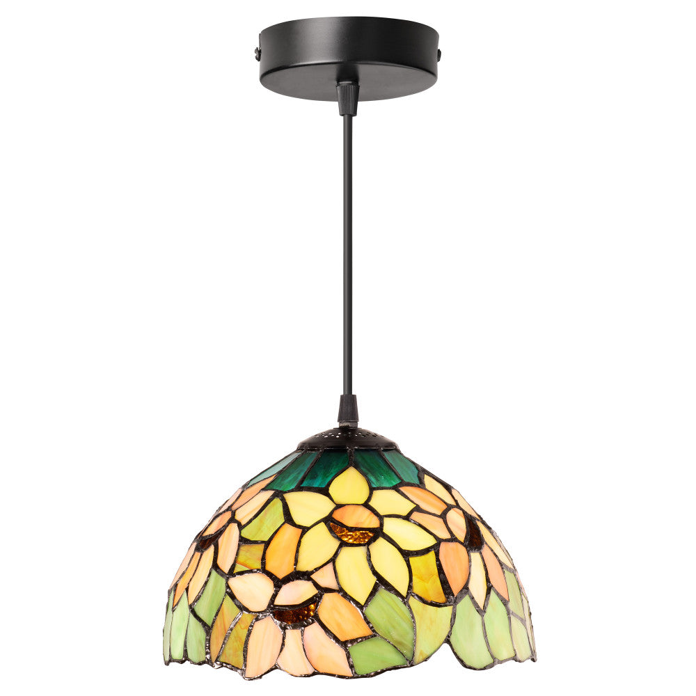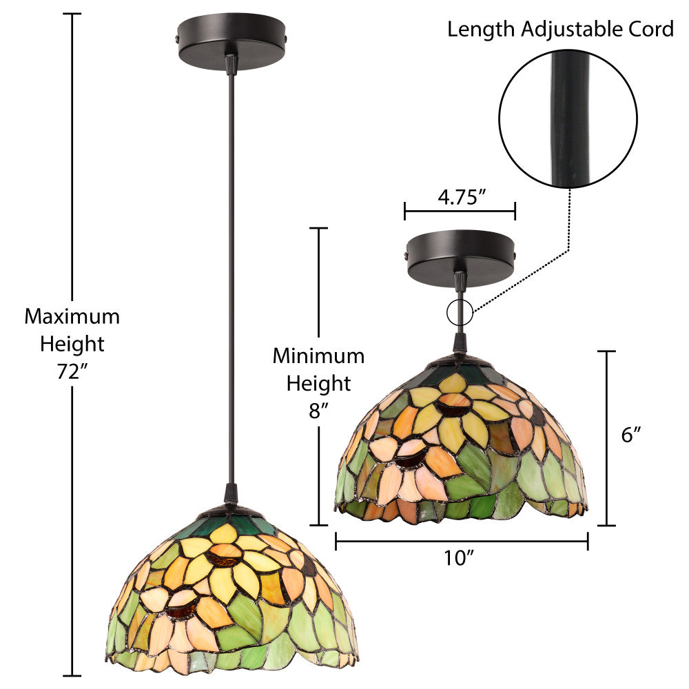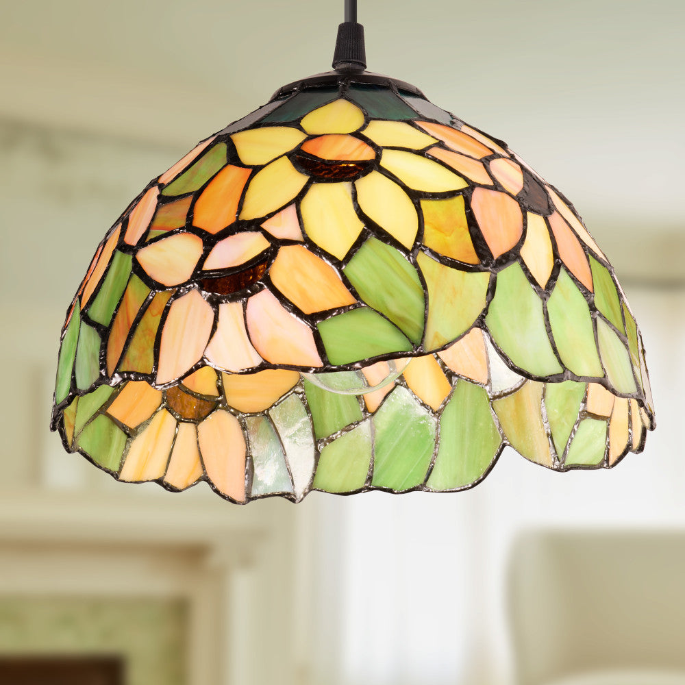 This Tiffany-style pendant light transforms any space with its vibrant sunflowers and stained glass design. Featuring a dome-shaped shade crafted from intricately cut glass in hues of green, yellow, and orange, this fixture exudes warmth and charm. The adjustable hanging cord allows you to customize the height from 8 to 72 inches, making it suitable for various ceiling heights. Perfect for adding a traditional touch to your home, this light requires one bulb (not included) and offers downlight direction for optimal illumination.