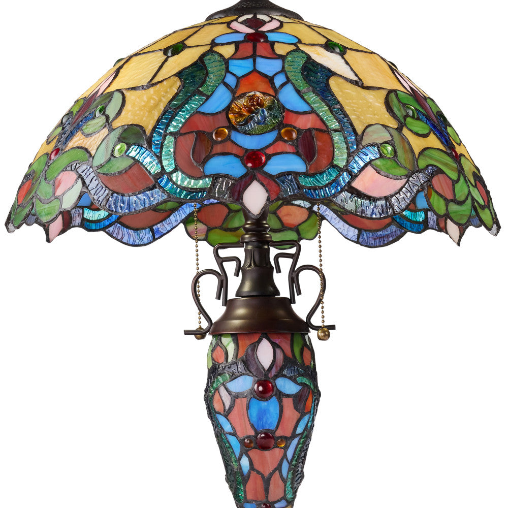 Add a touch of elegance to any room with this exquisite table lamp. Its urn-shaped base, finished in antique bronze, beautifully complements the vibrant stained glass bowl shade. Featuring classic Victorian patterns, this lamp captures attention with its handcrafted design using 467 pieces of glass and 50 cabochons, including rosettes. The pull chain switches and 72-inch cord offer easy operation and flexible placement options. Ideal for bedside or accent tables, this lamp provides a warm and inviting glow.