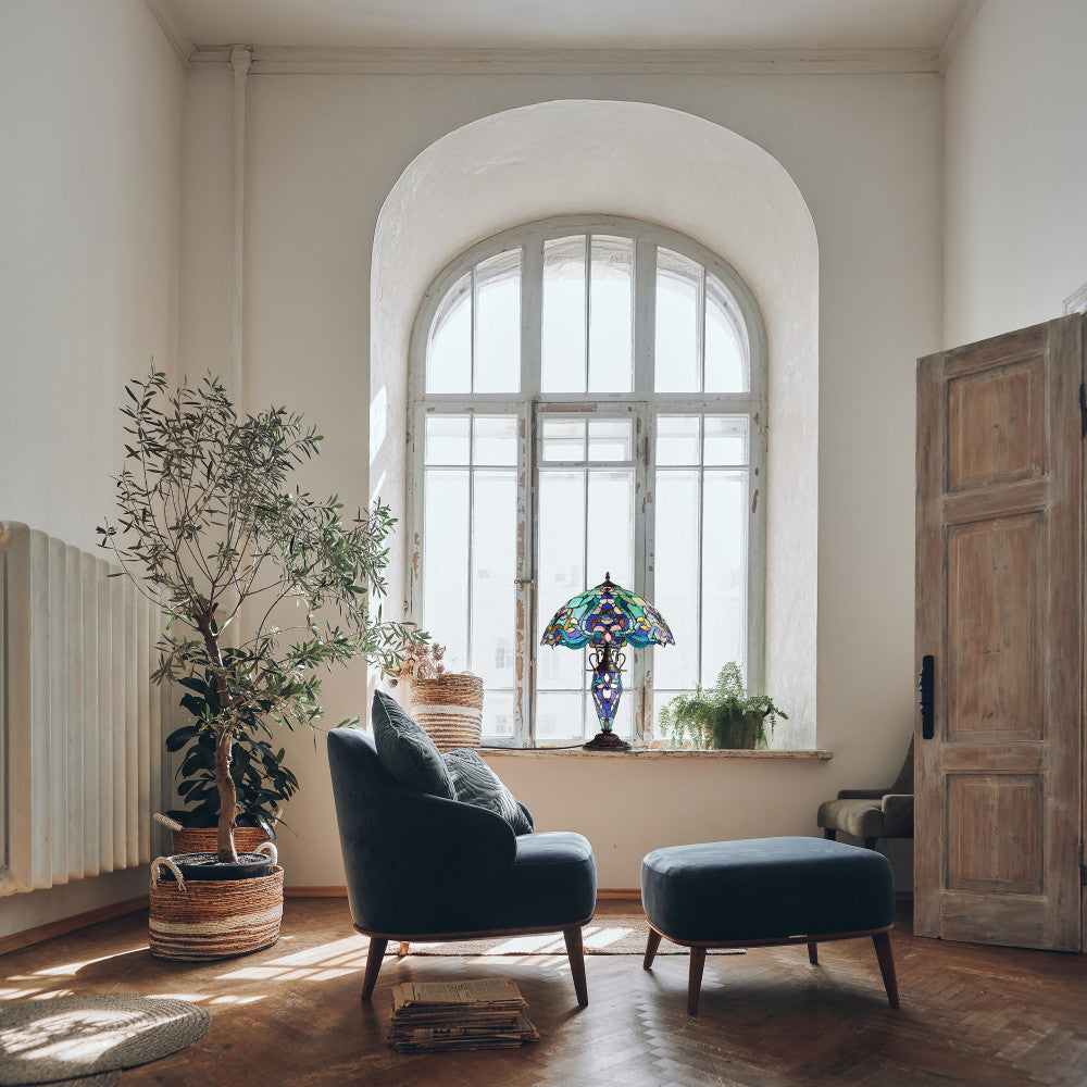 24" H Margaret Double Lit Teal Tiffany Style Stained Glass Table Lamp on a table next to a yellow sofa with blue cushions.