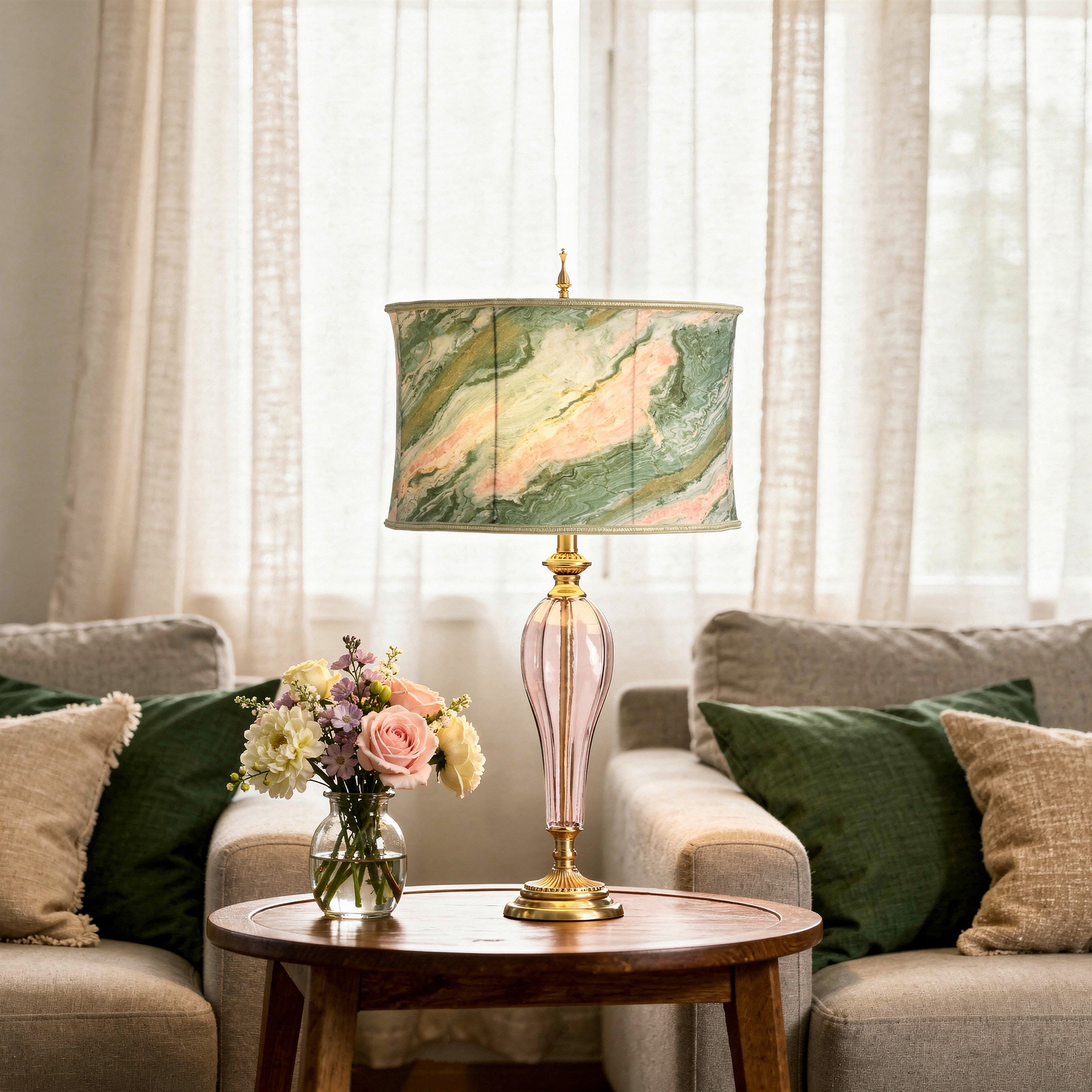 Enhance your space with this bohemian-inspired table lamp, featuring a captivating geometric pink and gold metal base that exudes elegance. The drum shade showcases a vibrant marbled pattern of pinks, greens, and creams, adding a touch of artistic flair to any room. With its multi-directional light, this lamp is perfect for creating a warm, inviting atmosphere. The on socket switch and 60-inch cord provide convenient placement options, while the lamp's UL listing ensures safety and quality. Requires one 60-watt bulb, not included.