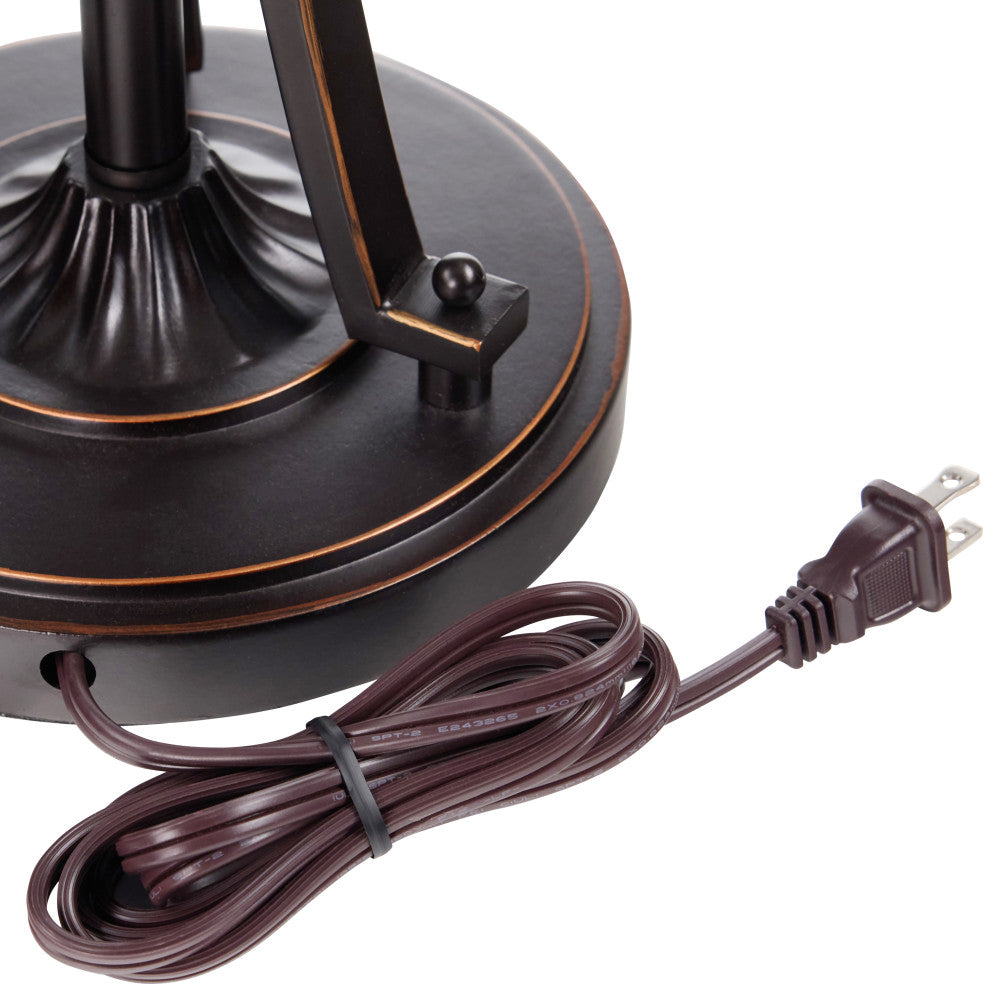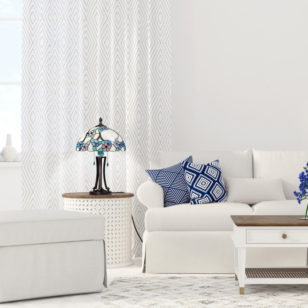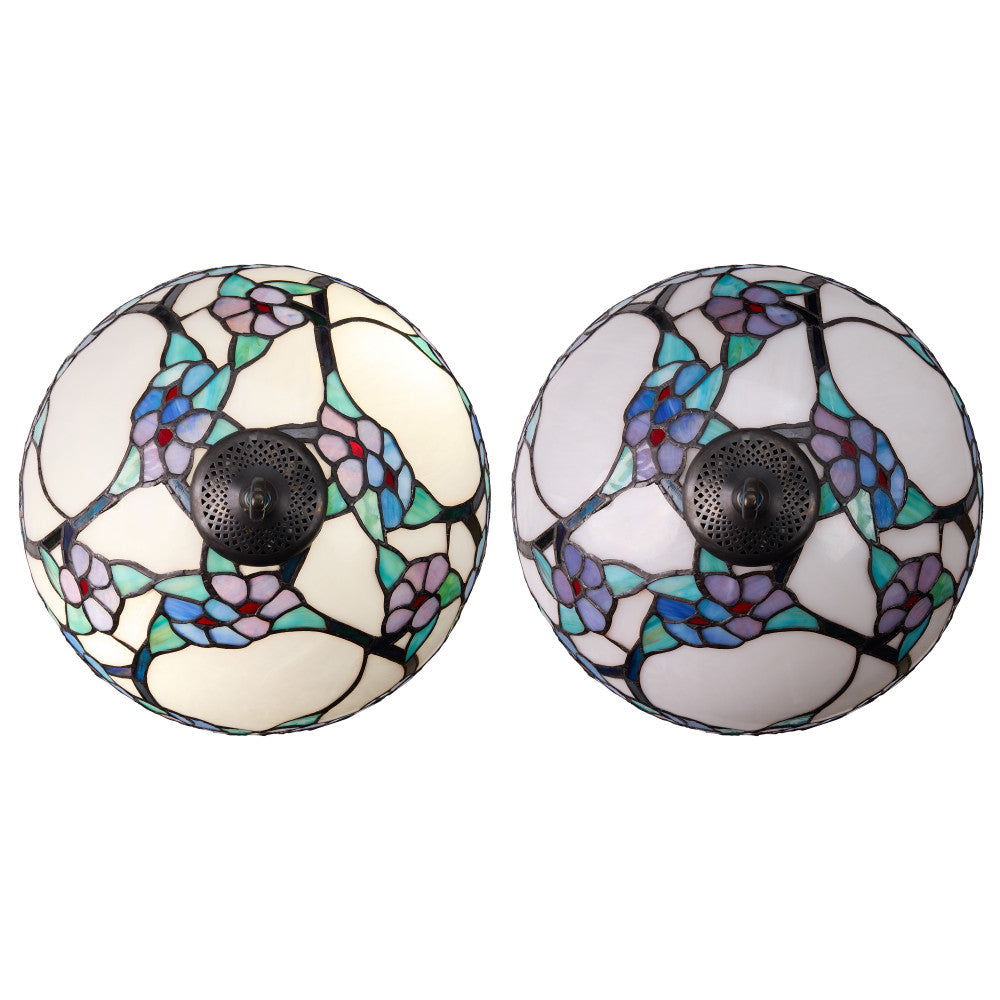 Brighten your space with this traditional Tiffany-style table lamp, showcasing a charming floral motif in vibrant teal, blue, and purple hues on a stained glass shade. This exquisite piece features an antique bronze geometric base, enhanced by teal faceted crystal accents on both the base and the pull chains, adding a touch of elegance to your decor. With convenient pull chain switches and downlight design, this lamp provides practical illumination, making it an ideal choice for bedside or living room ambiance.