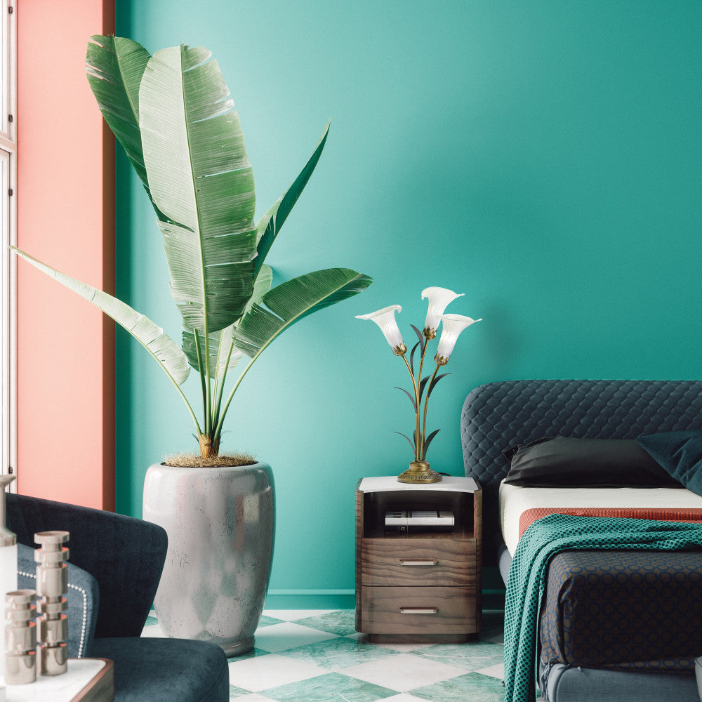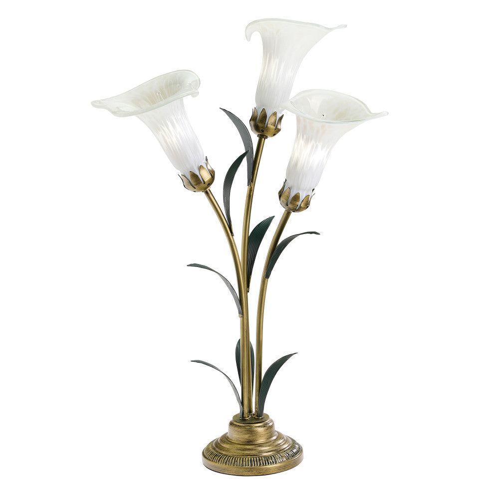 This novelty table lamp with unique floral shades marries vintage and traditional styles, creating a beautiful and unique lighting option for your bedroom, living room or entryway. Showcasing a brushed bronze novelty metal base accented with green painted leaves and designed like flower stems leading up to 3 calla lily shaped glass bell shades, this table lamp casts a soft glow with three 15-watt Type C bulbs (not included). A great pairing with Bohemian, transitional or eclectic decor, it also features a 63-inch cord with an in-line switch for versatile placement.