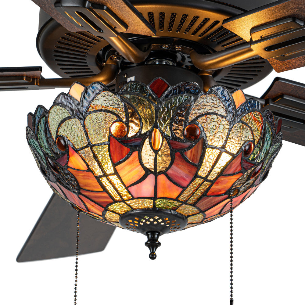 Infuse your home with elegance and enhanced comfort with this stunning ceiling fan. The piece showcases a captivating Tiffany-style stained glass shade in a multicolor design, made from 165 individual glass cuts. Set in an oil rubbed bronze finish, it perfectly complements the rich barnwood and light driftwood reversible blades. The fan's remote control offers easy operation, while the included dimmable 3-light fixture allows you to customize your lighting ambiance. Ideal for indoor use, this ceiling fan is a beautiful addition to any space.