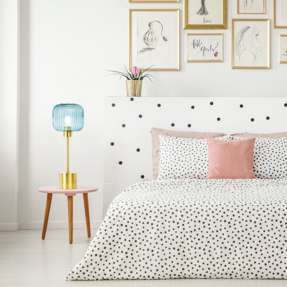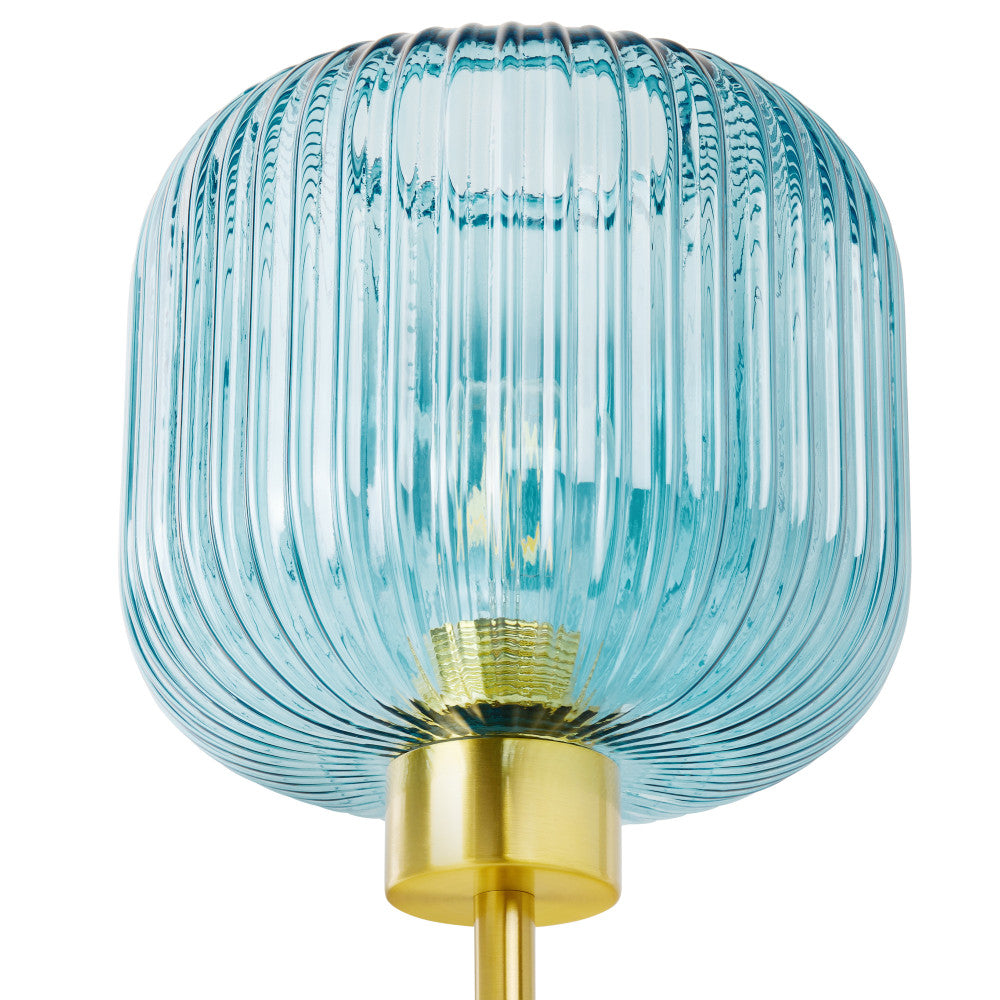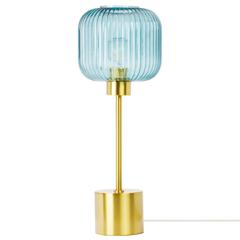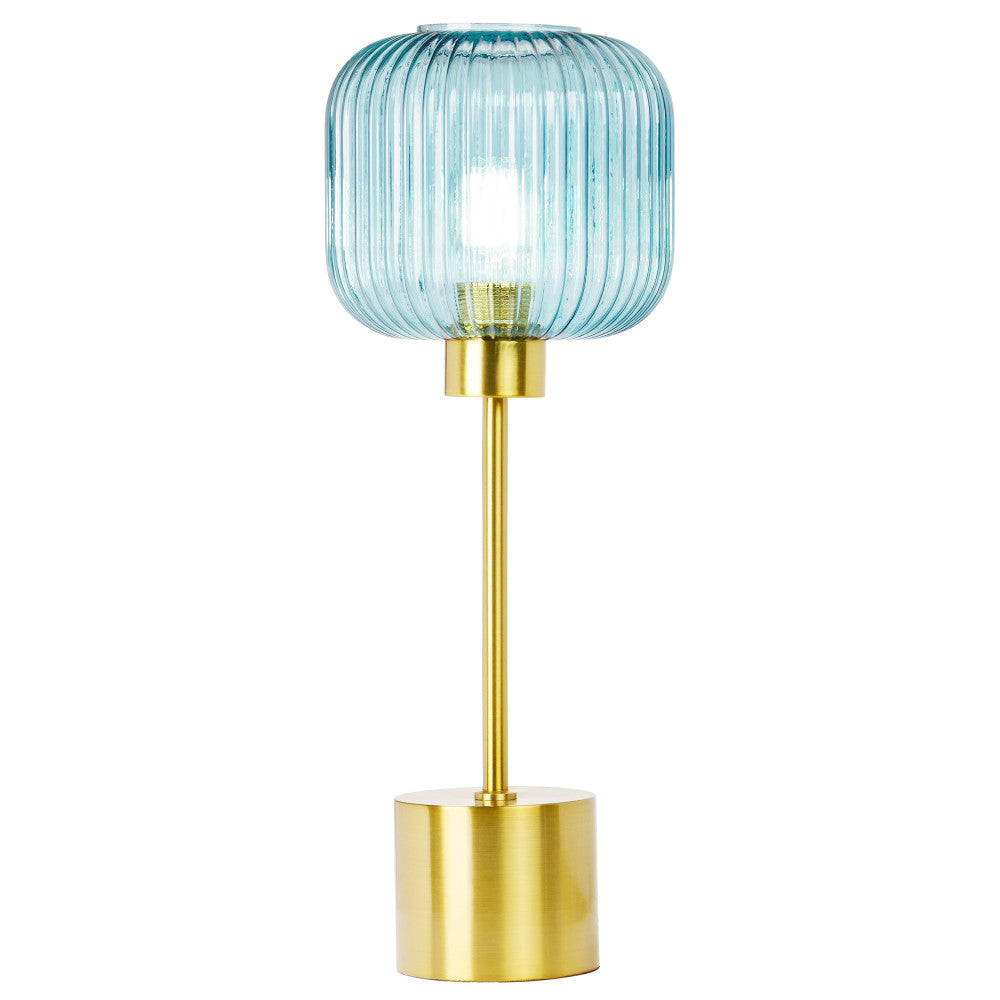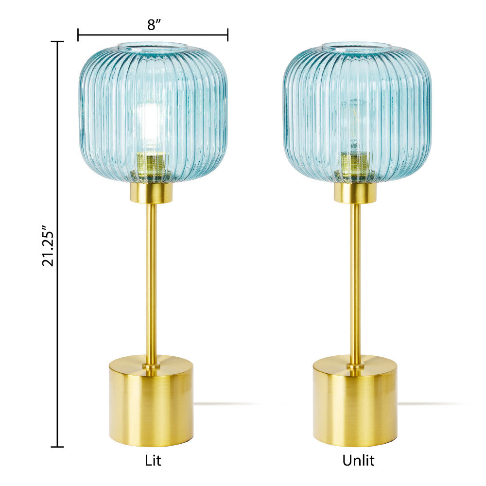 Shine a light on your glamorous surroundings with this retro-inspired table lamp. Its candlestick-inspired gold brushed metal fixture is supported by a matching cylindrical base, whose chunkiness is balanced by the globe-shaped shade fashioned from textured glass in a blue hue. This lamp will easily enhance your glam powder room or retro bedroom, thanks to its 60-inch cord. With the use of one 40-watt E26 bulb (not included), it will fill any space with a soft blue-infused glow.
