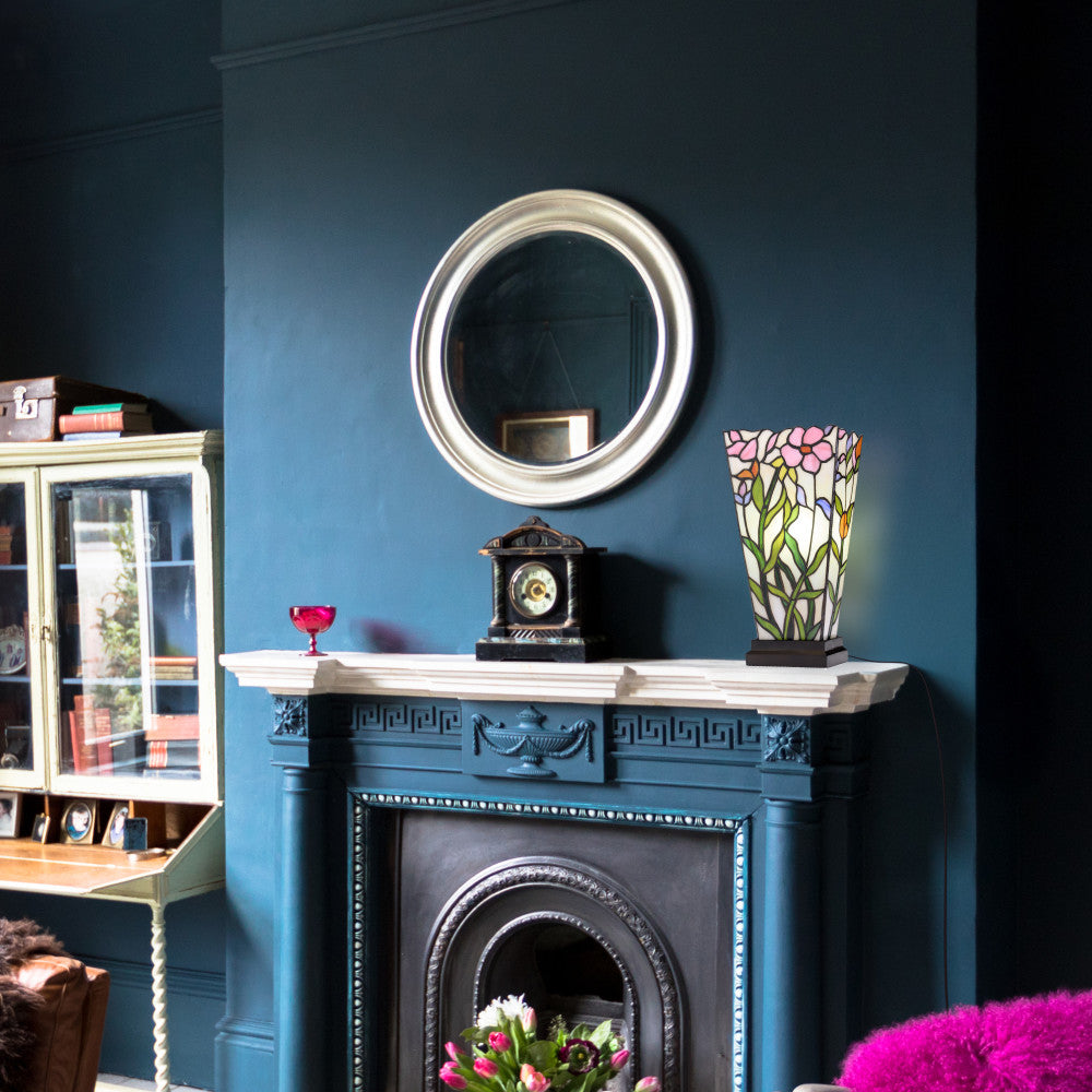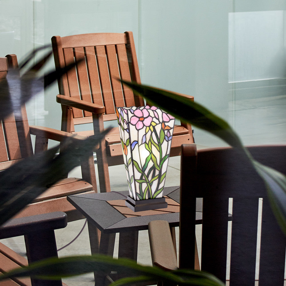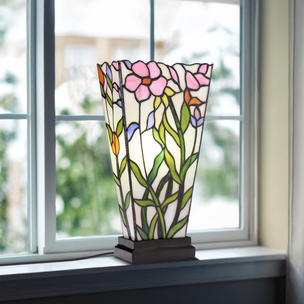 Elevate your home with this charming table lamp, featuring a handcrafted floral stained glass design. The lamp's base is crafted from polyresin, creating a sturdy yet elegant foundation. The vibrant multi-colored shade enhances any room's atmosphere, casting a warm and inviting glow. The lamp includes an easy-to-use on-off line switch and a 60-inch cord for convenient placement. Ideal for bedrooms, living rooms, or offices, this lamp requires one 40-watt type A bulb, not included.