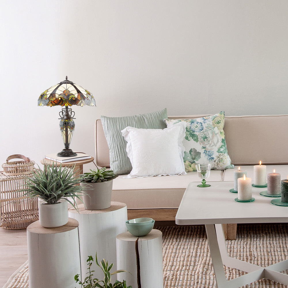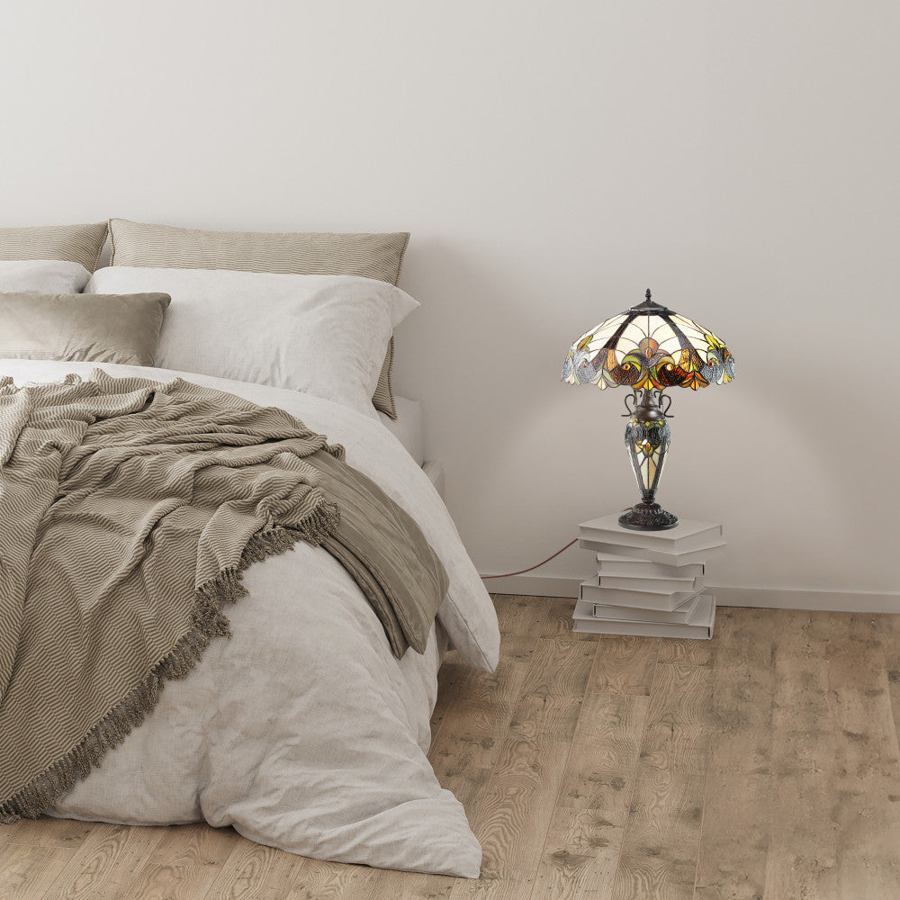 Urn-shaped polyresin base and intricate stained glass bowl shade