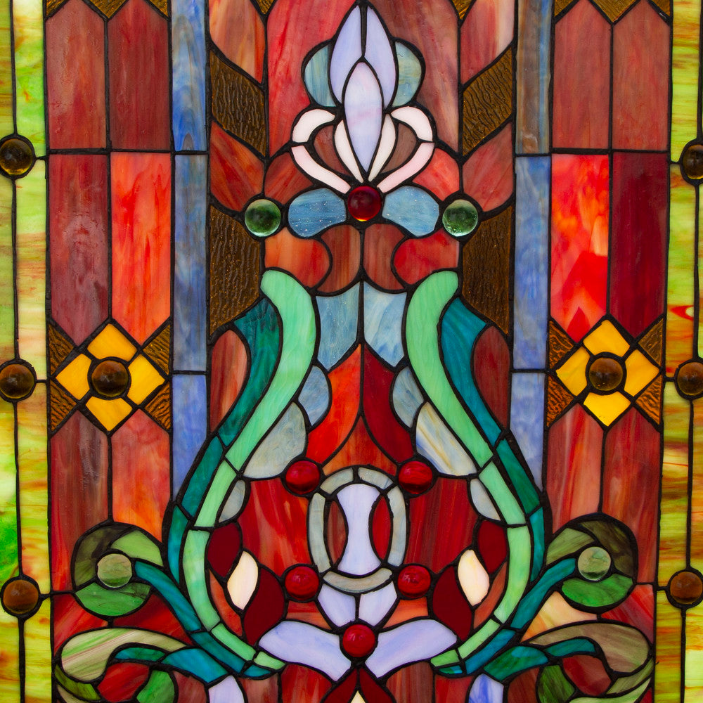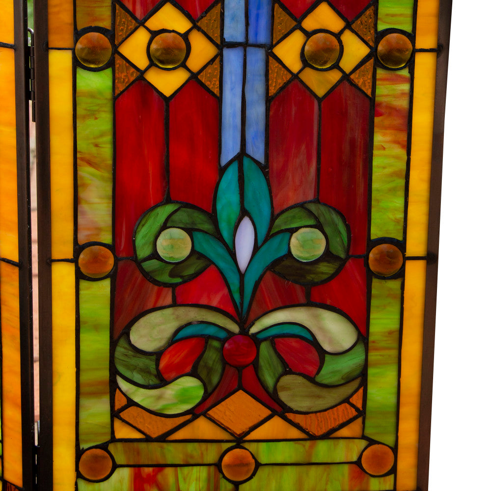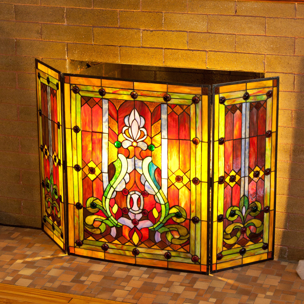 Parisian Dream. This Edwardian style fireplace screen has vibrant shades of orange, amber, red, green and blue crafted from 456 pieces of hand-cut glass and 62 cabochons. With so many colors it will accent many different decors. It serves as a wonderful way to cover up your fireplace when not in use. For illumination, place candles behind the screen for soft lighting. When fireplace is in use, please place screen at least 2 feet away to avoid damage to glass.