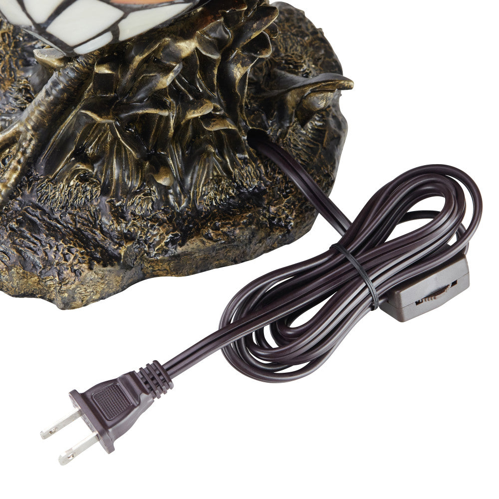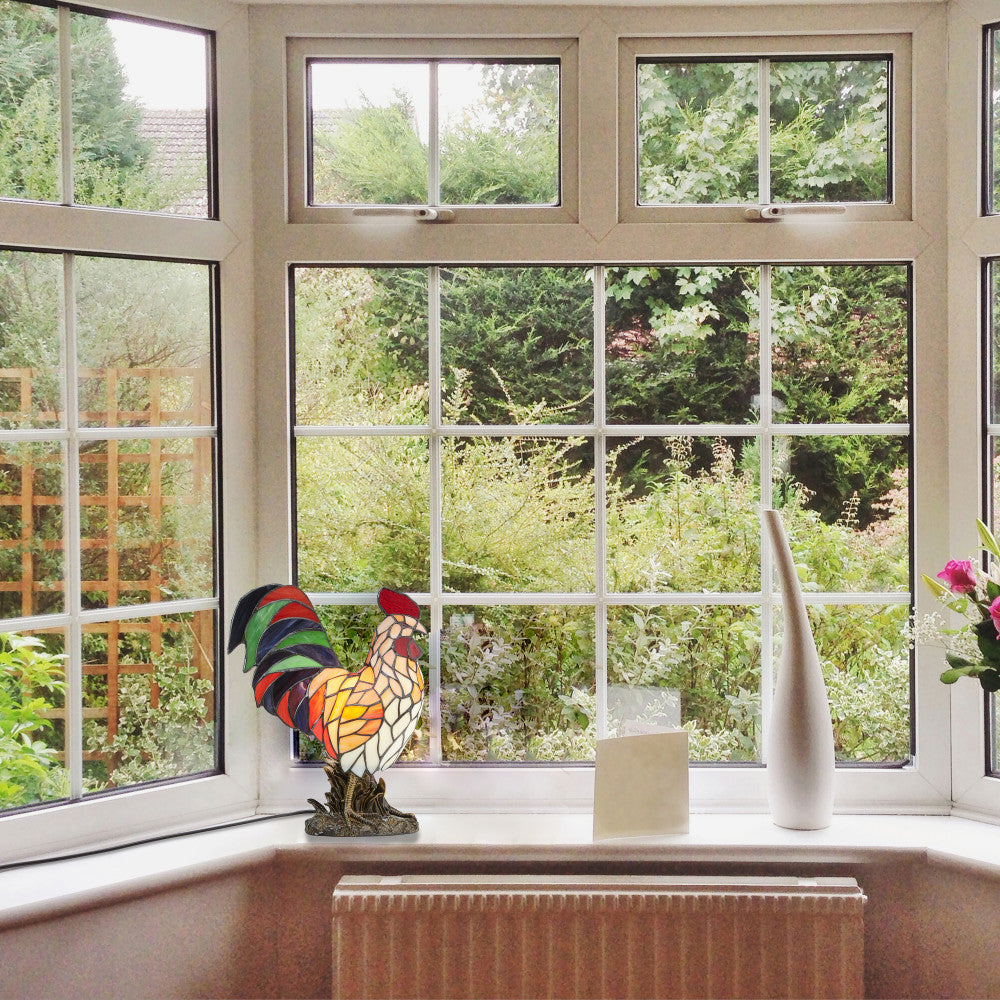 Cock-a-doodle-doo. This Rooster Stained Glass Accent Lamp will be a perfect addition to any space you chose. It is handcrafted with 168 pieces of glass and 2 cabochons. The intricate glass cuts are a variety of colors including amber, cream and deep chestnut red colors, accented with green and blue. The base is intricately carved to look like the feet of the rooster and the grass on which he stands. A must have for your rustic home.