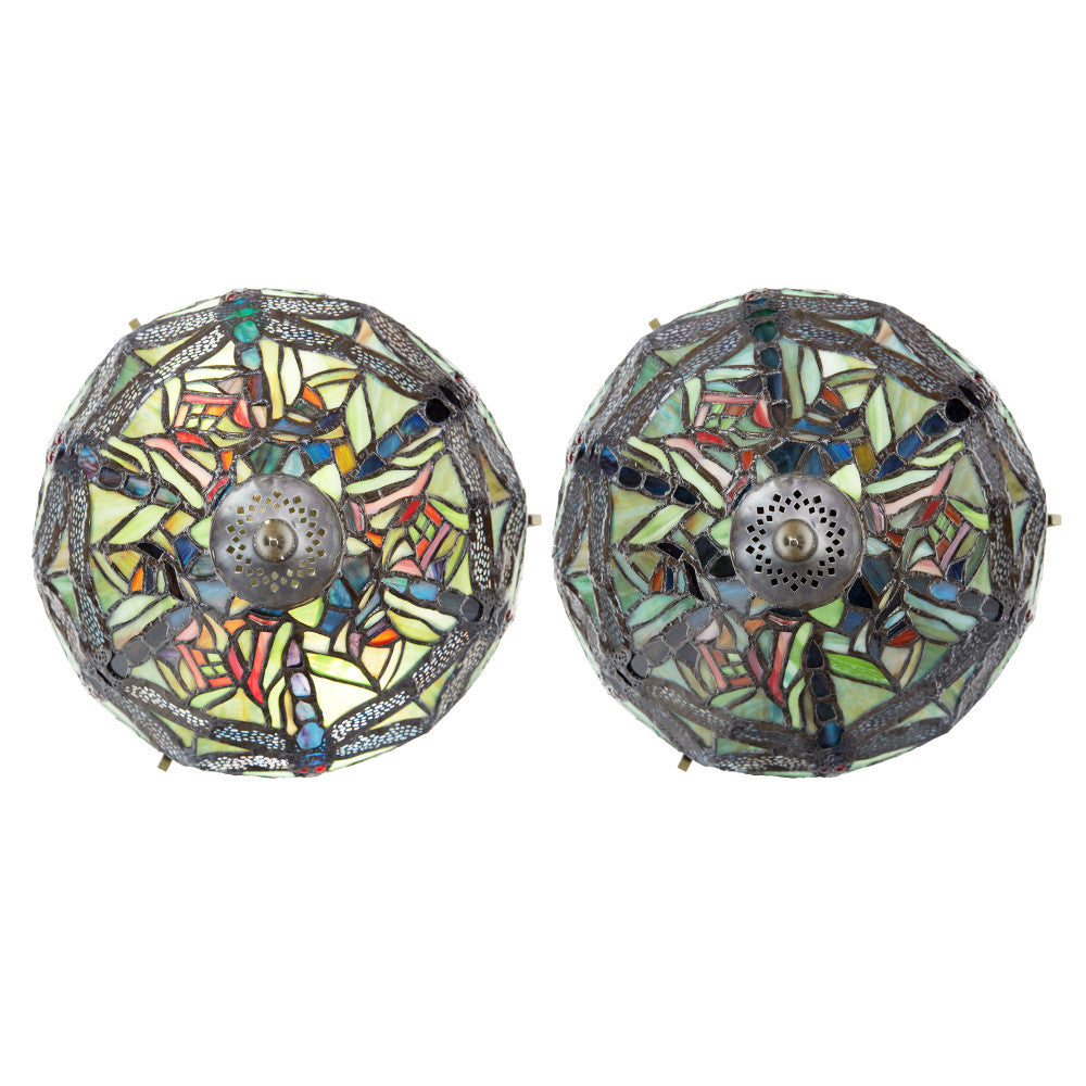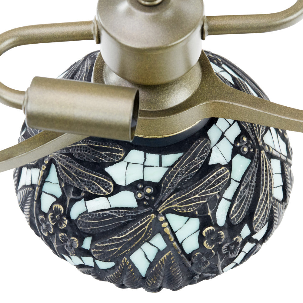 A True Classic. Inspired by the Hanging Head Dragonfly lamp originally designed by Louis Comfort Tiffany and Clara Driscoll, this mini version encompasses great detail and lively character. The dragonflies, buzzing above the elements of green, orange, and yellow glass cuts, leaves you feeling serene with nature. The base is detailed with dragonflies and mosaic glass pieces.